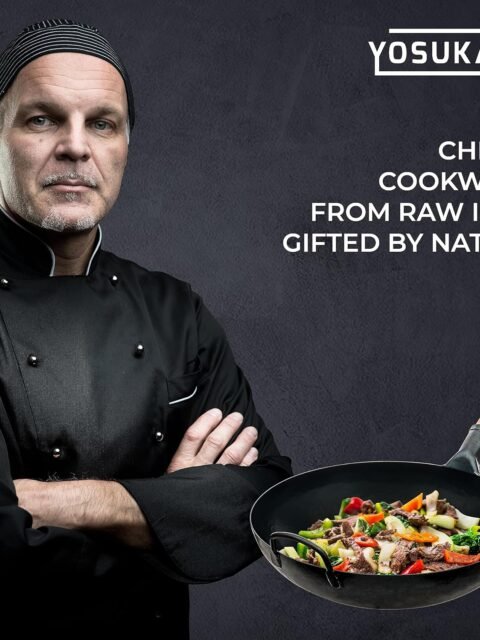 YOSUKATA 13.5in blue carbon steel wok—preseasoned, hand-hammered, flat-bottom. Heats fast, lids well; a durable, quietly elegant tool that rewards regular care.