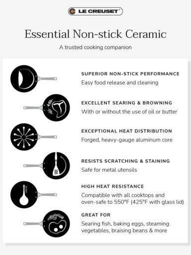 - Durable: tri-ply construction and metal-utensil compatibility.